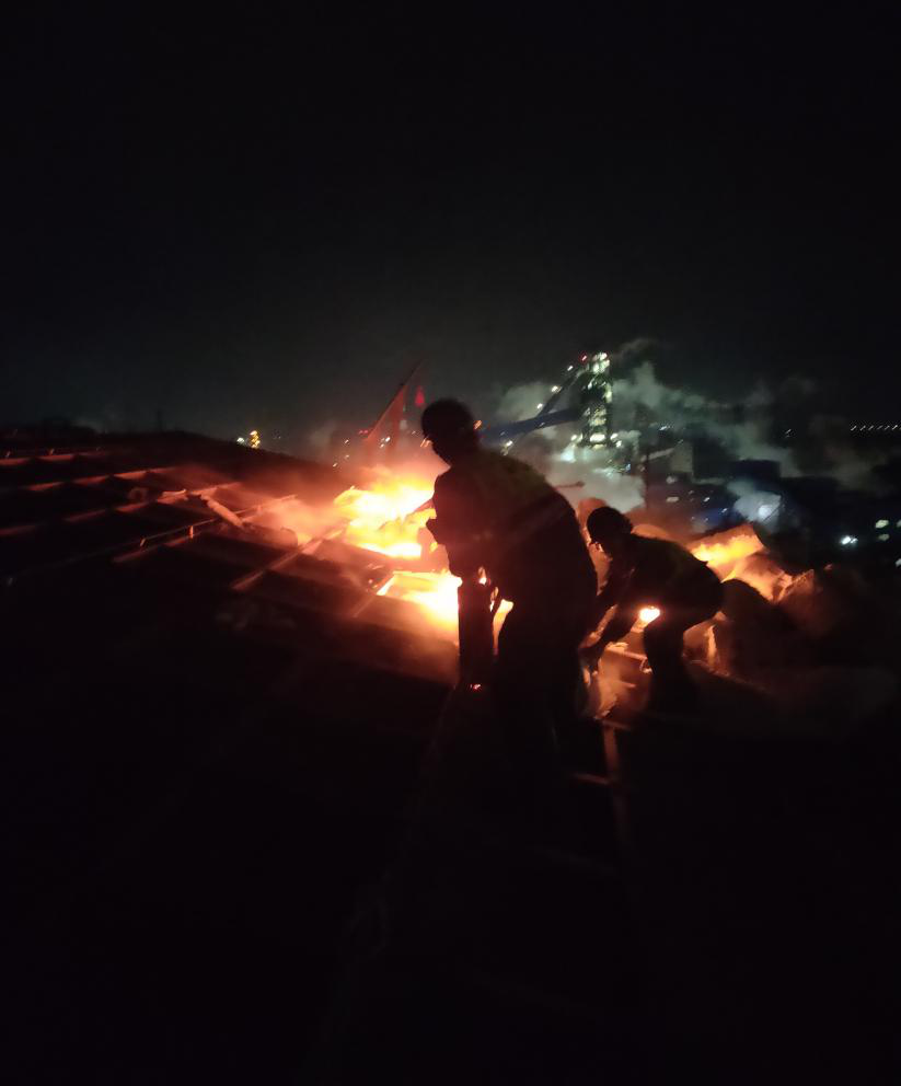 當(dāng)班長立即通知生產(chǎn)部部長并組織人員進(jìn)行滅火,265現(xiàn)場(chǎng)崗位人員雷鵬飛先行登上脫硝頂部進(jìn)行滅火。22:02生產(chǎn)部部長黃安軍、副部長游德元、楊平到達(dá)現(xiàn)場(chǎng)組織滅火,22:15火勢(shì)得到控制,明火撲滅。為避免再次著火,現(xiàn)場(chǎng)人員將脫硝頂部的保溫棉和編織袋徹底進(jìn)行清理。